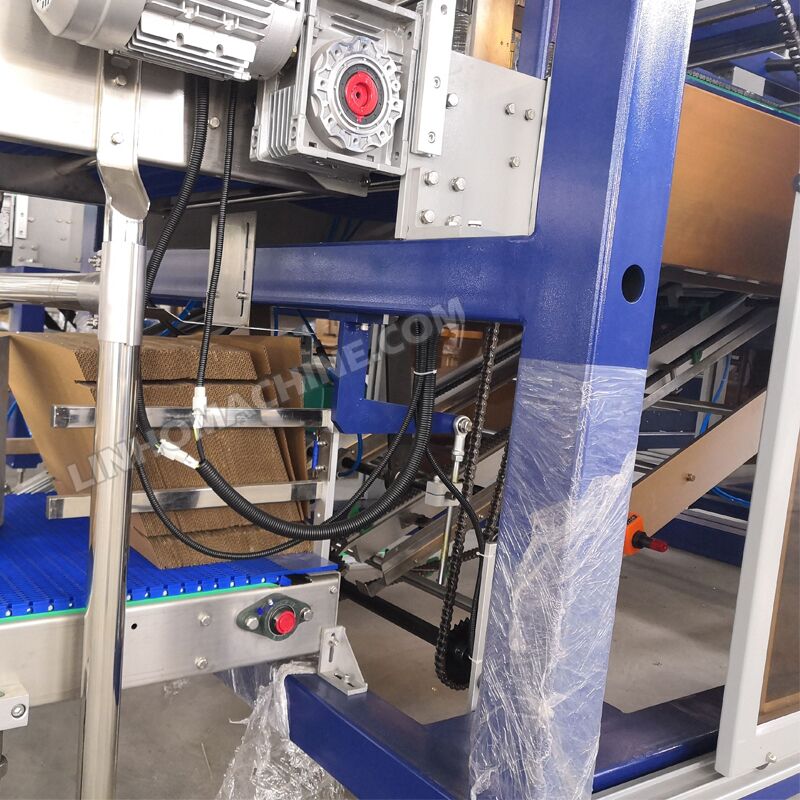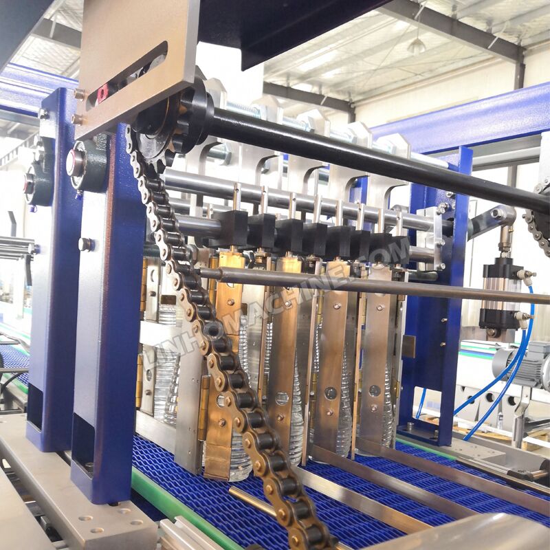 An automatic linear packaging machine is based on the characteristics of the packaging film heating shrinkage. It uses photoelectric switch sensor on-line detection to collect signal what is processed by the PLC (Programmable Controller). Conveyor belt continuous inlet bottle, bottle plate arrangement, gate-type grouping, continuous putter push bottle wrapping film, heating knife seal cut into bags, heating channel shrinkage, cold air cooling shaping, and other institutions complete the entire packaging process.