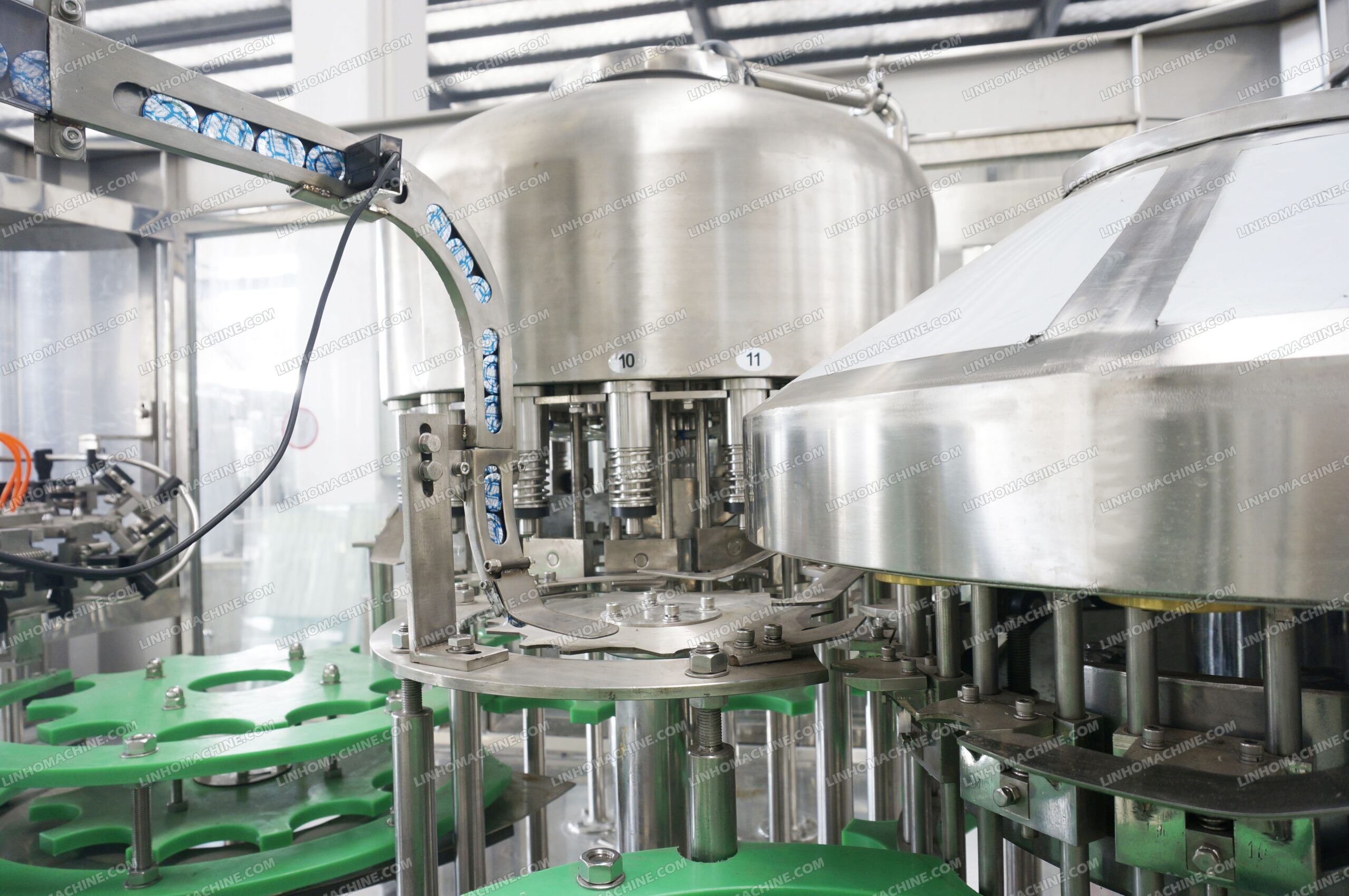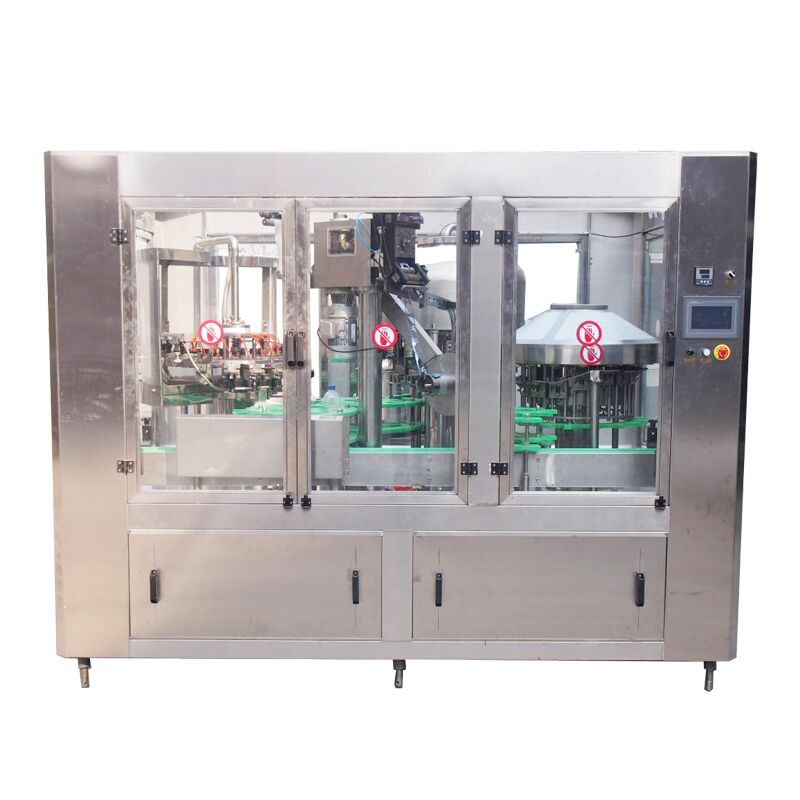 This equipment is mainly composed of rinsing machine, filling machine, capping machine, Workbench, inlet and outlet bottle arc plate, star wheel, motor transmission, frame, and gas-electric control part.