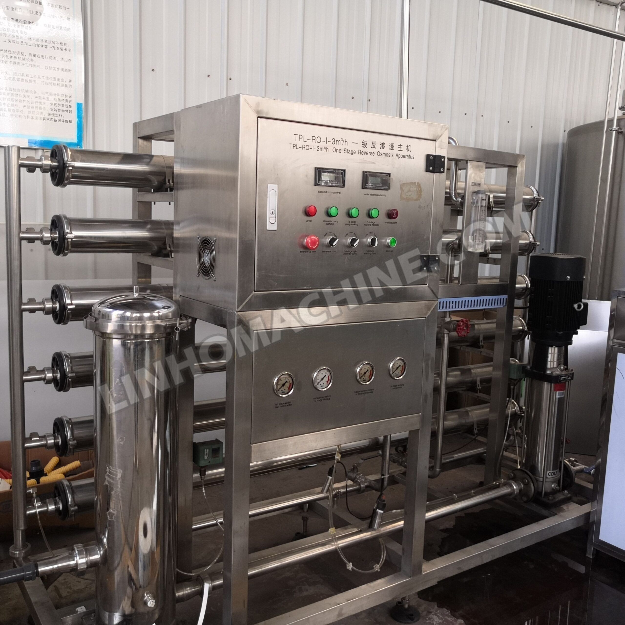 Reverse osmosis technology is the most advanced and energy-efficient membrane separation technology today. The principle is to use reverse osmosis pressure to separate these substances from water by the semi-permeable membrane. Because the membrane aperture of the reverse osmosis membrane is very small (only about 0.0001 microns), it can effectively remove dissolved salts, colloids, microorganisms, organic matter, etc. from the water (removal rate up to 97%-98%). Reverse osmosis is one of the most widely used desalination techniques in deionized water equipment, and its separation object is the ion range in solution and the organic matter of molecular weight hundreds of.